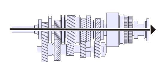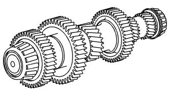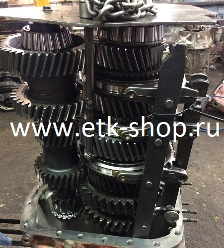 Поток мощности заходит через первичный вал, на котором снаружи «висит» сцепление, внутри кпп установлена шестерня делителя и синхронизаторы делителя, далее вторичный вал (или главный вал) с основными шестернями трех передач, тихоходная передача (черепашка более привычное название) и задняя скорость. На фото — вторичный вал в сборе