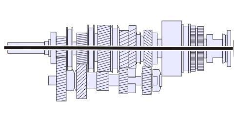 Все шестерни на вторичном валу установлены на игольчатых подшипниках, кроме самой нагруженной шестерни третьей передачи, она стоит на двух радиально-упорных подшипниках. Промежуточный вал (или контрвал) коробки имеет жестко сидящие (запресованные, только их можно заменить в случае поломки-облом зуба например) шестерни делителя и третьей передачи, остальные шестерни выполнены заодно с валом и, в случае поломки, меняется полностью вал (весьма не дешевое удовольствие на фоне стоимости других з/ч). На фото можно увидеть схематичное изображение вала